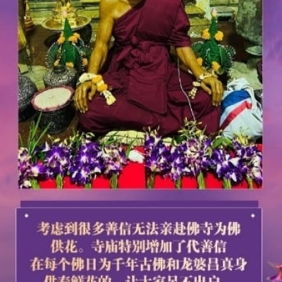 考虑到很多善信无法亲赴龙婆昌庙为佛供花。寺庙特别增加了代善信在每个佛日为千年古佛和龙婆昌大师供奉鲜花的项目。让大家足不出户,并以极低供金的方式为自己和家人佛前供花,消灾祸,添福报,增功德。🙏
