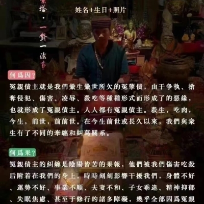 ✨阿赞素塔冤亲债主珐事🔥🔥……【化解冤亲债主珐事】 冤亲债主不是一世结的,生生世世,冤亲债主可能是一群一群、一队一队,数目之多,几乎没法子计算。 要化解冤亲债主心中的仇恨,不是短时间可以办到的事情,必须要发长远心为冤亲债主永脱恶道来修行,来让冤亲债主感受到我们真诚忏悔的诚意。 因果承负均因人的举动而时刻变化积累。所谓一念而动劫,一切孽缘劫难、疾病难安、小人邪祟、灾祸无常、运势起伏动荡者,皆因累世的、今生的冤亲债主而起。 所以超度冤亲债主是结善缘福缘,断恶缘孽缘的上等途径。