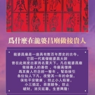 龍婆昌廟是一座具有數百年歷史的古寺。它因一代高僧龍婆昌大師曾在此剃度出家而名震天下。凡在龍婆昌廟做接貴人的善信 ,寺廟高僧將為其貴人符念經一整年 ,幫助接引各位仙人下凡,改變其一年的命盤,保佑平安健康 ,防止小人陷害,小三插足,惡意競爭,防止破財,消災延壽,生意興隆!