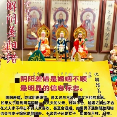 ✨【☯️化解阴差阳错珐事】阴阳差错日是婚姻不顺最明显的信息标志。 阴阳差错,亦称阴差阳错,是太过与不及、男女不和的意思。 如果女子遇到阴差阳错,与丈夫的父亲、姊妹不合,妯娌之间也不合 在丈夫家不得志不讨夫家喜欢,甚至会退婚。如果男子遇到阴差阳错 也会与妻子娘家是非很多。不论男子还是女子,如果在月柱、日柱、时柱见到两个或者三个阴差阳错,表现出来的不合现象特别严重,尤其是日柱犯之,更加明显。男子即使有老婆,也会离婚或者不睦,日子久了还会与妻家生仇,不相往来…