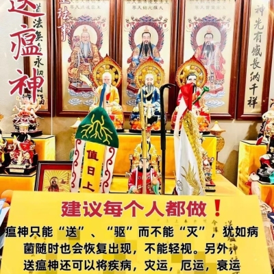 ✨【☯️送瘟神】让你不顺,莫名灾祸都是瘟神原因。传说瘟神有五位,分别是春瘟张元伯、夏瘟刘元达、秋瘟赵公明、冬瘟钟仁贵、总管中瘟史文业。除了平时里要祭祀瘟神之外,等到过年的时候还要集体的“送瘟神”,以祈求来年没有疾病,一家人能够健康平安。瘟神只能“送”、“驱”而不能“灭”,犹如病菌随时也会恢复出现,不能轻视。另外,送瘟神还可以将疾病,灾运,厄运,衰运(破财被骗)全部送走...送走瘟神才能真正的体会到什么叫四方无碍,心境空明。