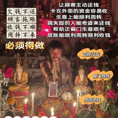 师傅的法事能帮助善信快速收回原本属于自己的钱,多轨道有更多收入,弥补自己失去的钱财,顾客主动还钱,欠的钱容易收回来,让自己身上吸取更多旺气,消除生意上的种种障碍,让钱容易回来自己的口袋!