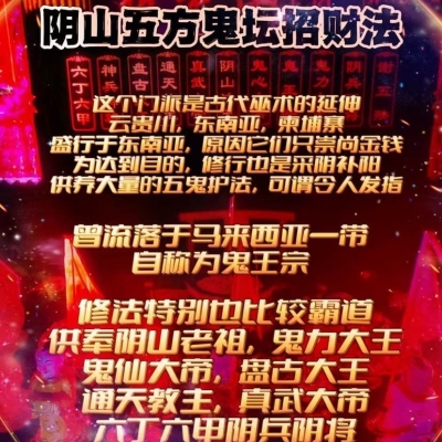这个门派可以说是古代巫术结合了巫术,闾山,茅山法脉传承,以令旗调兵遣将的延伸。活动在中国云贵川一带,而盛行于东南亚,尤其是柬埔寨。原因是他们只崇尚金钱,为达到目的,修行也是采阴补阳。供养大量的五鬼护法。可谓令人发指也曾流落马来西亚等地,自称为鬼王宗请天官五路文武财神帮忙。收集欲望器招来客户。