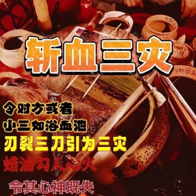 令对方或者小三 如浴血池 三刀引为三灾 这惩戒类型法事需卸去掉对方的运势,让目标人物 小人 恶人 小三 仇家倒霉,严重,败坏,衰弱,另类对方生病,霉倒,小增人多,家庭吵争,夫妻同伴情感情破,裂离婚,生意败坏,财衰运败,运势落低,生活各种顺不,发生事故外意灾难,体弱多病。