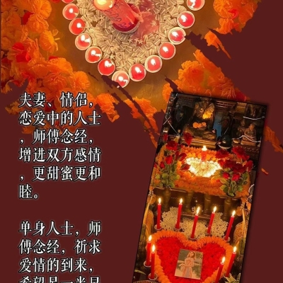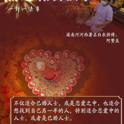 此法事为专场“一对一”祈福祈愿和合法事,增进情侣、夫 妻、男女朋友间的感情,单身人士更推荐做。