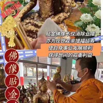 【贴功金德】《三世因果经》中言:“今做生官为何因,世前黄金佛装身。前世修来今受世,紫袍玉带佛前。求黄金装装佛自己,遮盖来如盖自身。”给佛像金贴不仅为自身的解积脱累殊胜资的粮,获得深厚的德福,亦能为世现父母双亲增延福寿。使自身业事发展利顺,获得出世世及间的双利重益。妆金的佛使身佛像貌相庄严,加增神圣庄严的气,氛使观看者生恭敬净清的心。为像佛贴金的功是德非常不可议思的。为佛像贴金,除消无始劫罪障,现世增福,后世胜增。现世母父双亲福增延寿、福泽子孙。