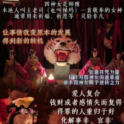 四神​​女是​师傅​,本地​人叫土老​司(也叫​梯玛​)​一直​​敬​奉​​​​的​女神,通常用来​祈福​、祈愿等❗灵验非凡❗